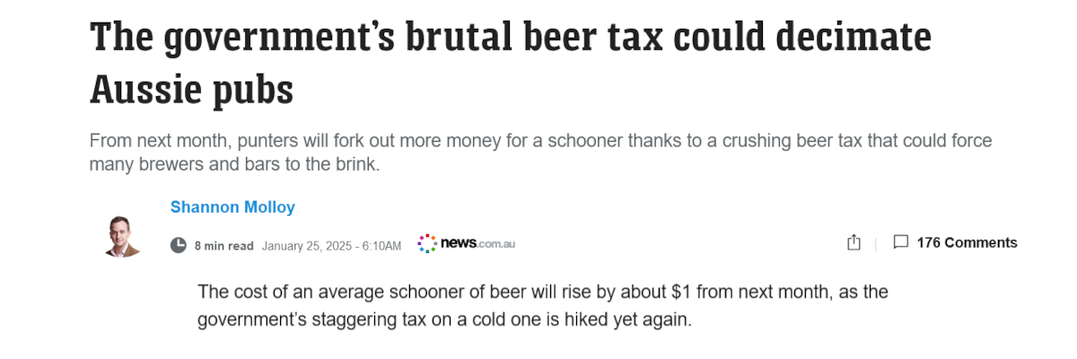 “…it’s getting to the point where almost half of this schooner is tax.” Let’s do the math. Blackflag’s hero beer is Rage, a 6% ABV hazy pale; a schooner is 425ml which gives us 0.0206 excisable litres of alcohol because the first 1.15% is exempt; at the relevant rate of $43.39 that’s… eighty-nine cents. And to be clear, they will not sell you a schooner for $2.7 (It’s not 1987 anymore.)
